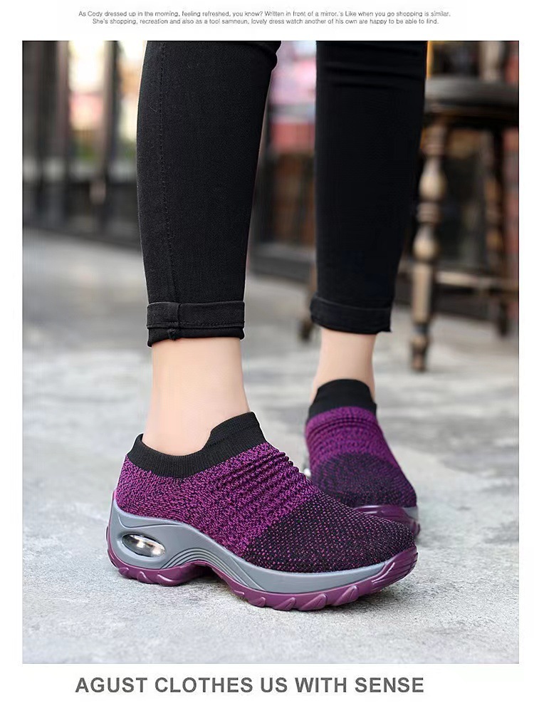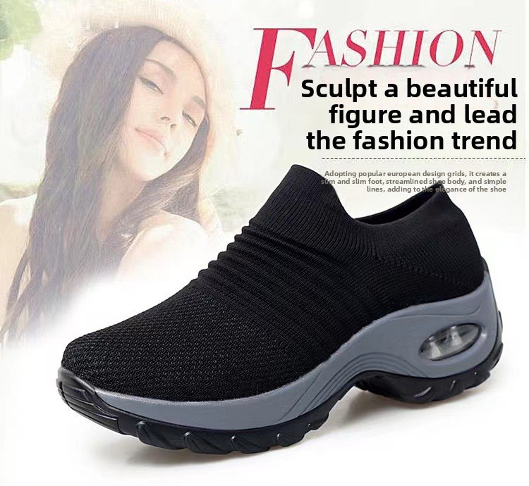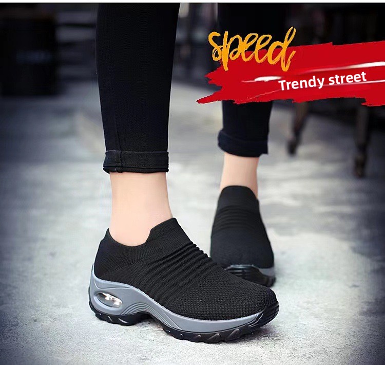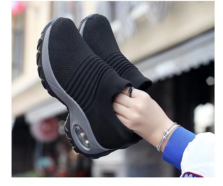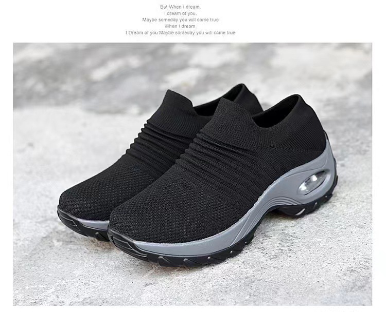 Schwarze Damen-Plateau-Sneaker zum Hineinschlüpfen | Sockenschuhe mit Luftpolsterung | Strick-Mesh-Schuhe mit dicker Sohle