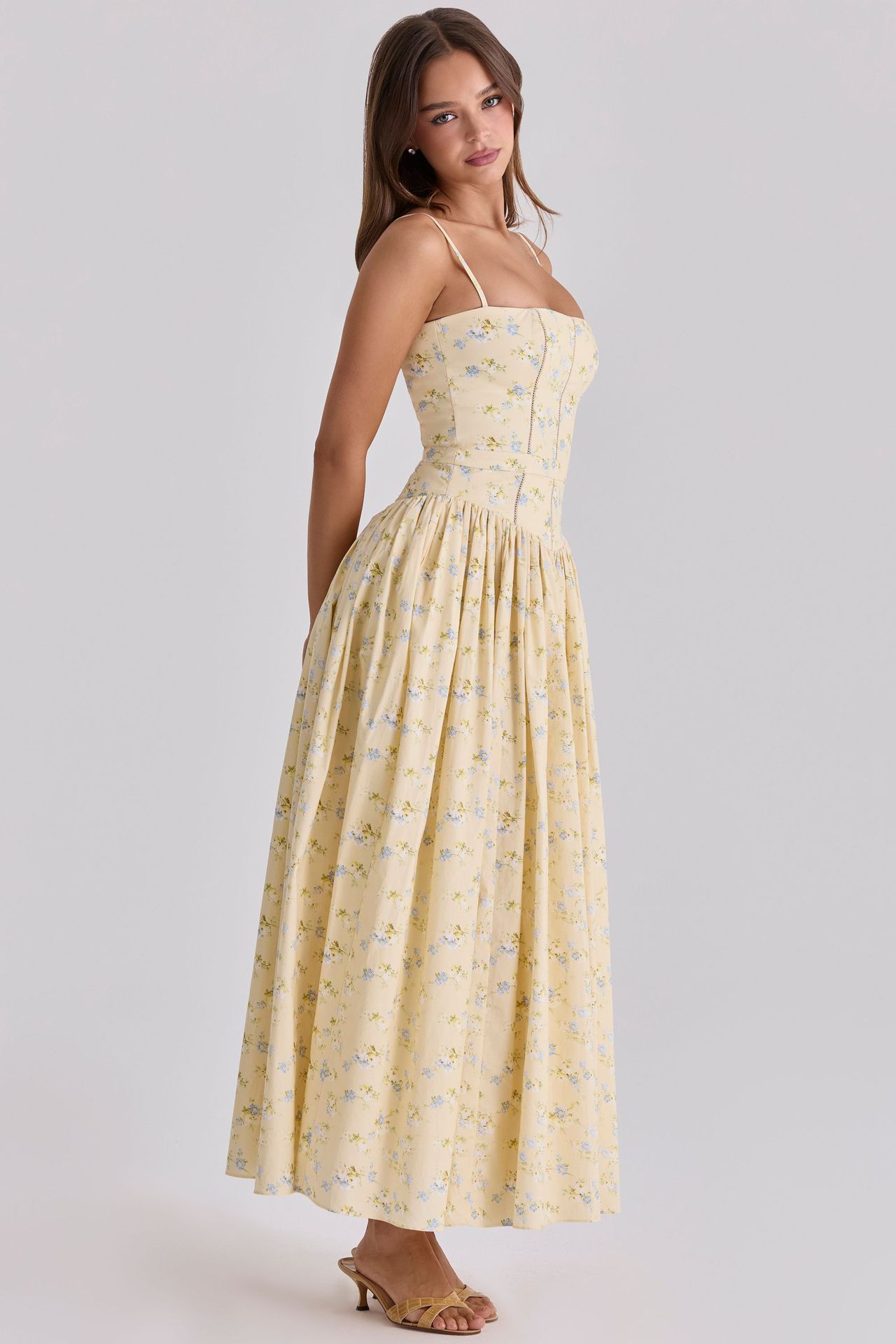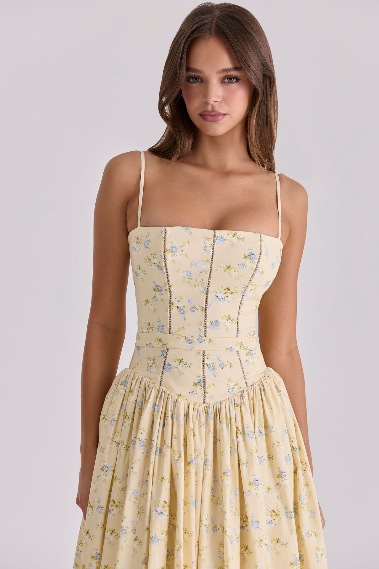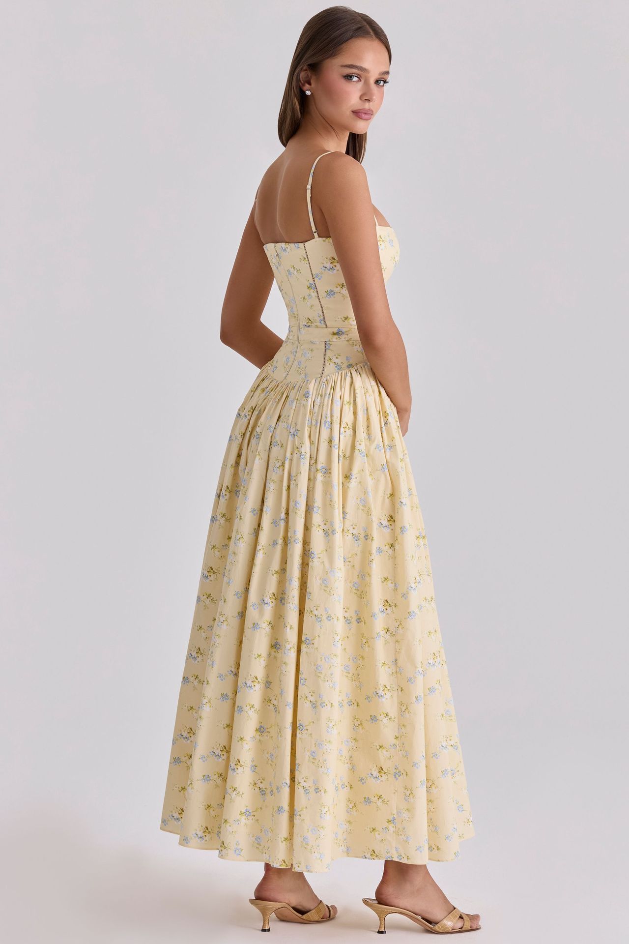 Damen Gelbes Blumen-Maxikleid mit Korsett - Spaghettiträger-Bustier mit gerafftem, voluminösem Rock - Sommerkleid mit zartem Blumenmuster im Cottagecore-Stil für Hochzeitsgäste, Gartenpartys & Urlaub