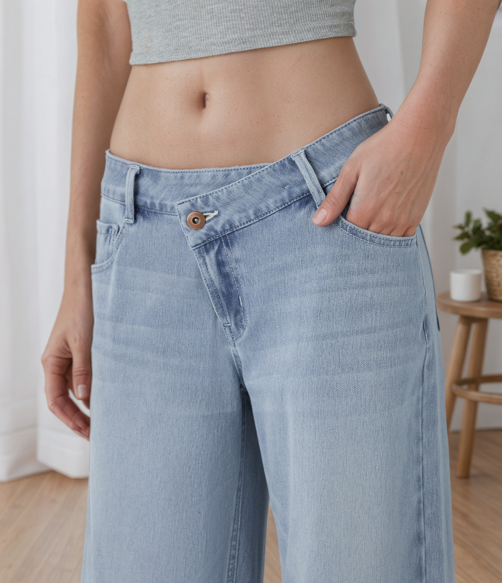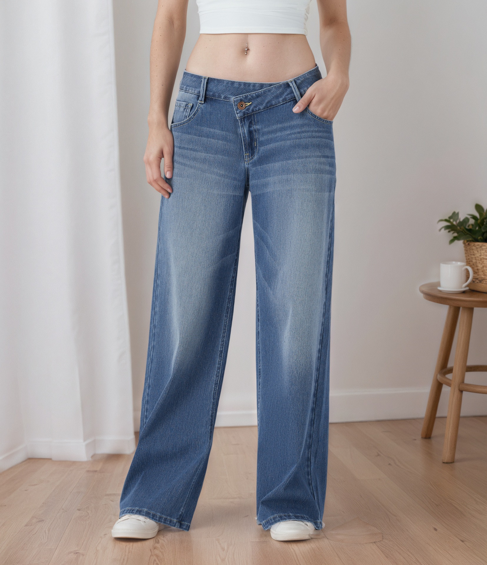 Jeans larghi a vita bassa da donna lavaggio chiaro | Pantaloni di jeans ampi con vita a V