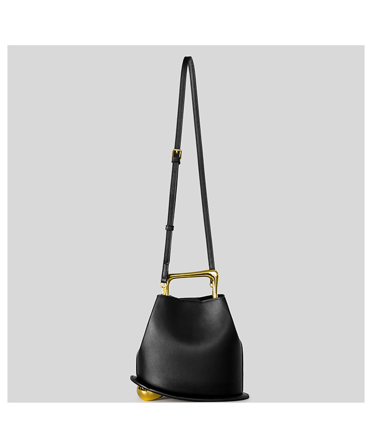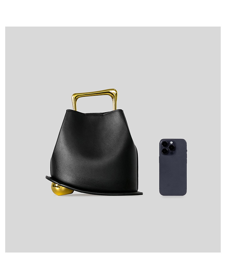Expertly crafted from premium smooth black leather, this avant-garde handbag features clean lines and minimalist aesthetics that let the statement hardware take center stage. The innovative gold-tone metal handle creates a stunning visual contrast against the sleek black leather, while the geometric design reflects contemporary art and architecture. The structured bucket shape provides surprising capacity while maintaining a compact, refined appearance. Complete with a detachable shoulder strap and charming gold sphere detail, this bag offers both style and versatility.