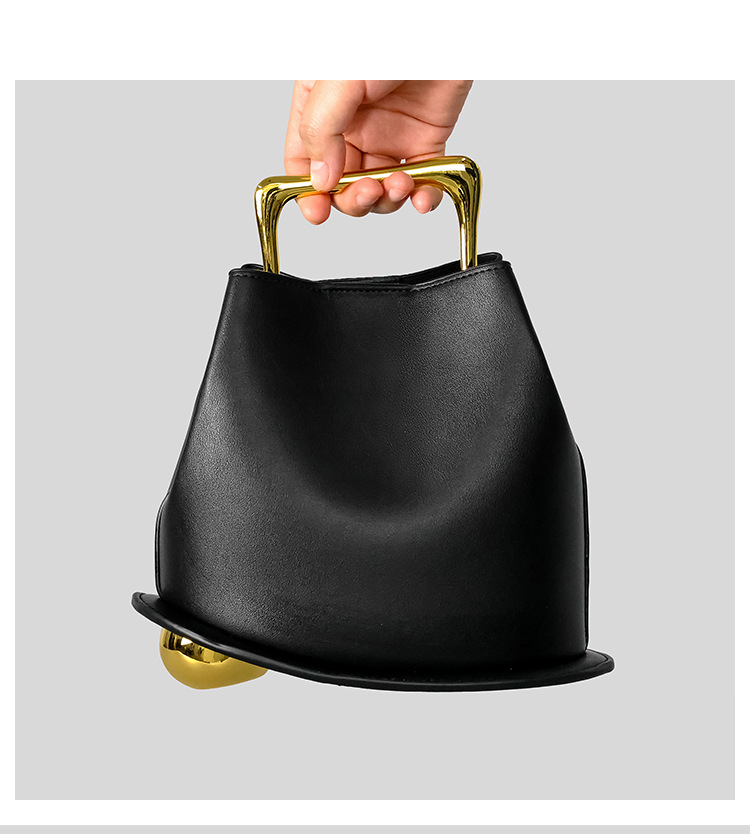 Make an unforgettable impression with this striking black leather bag featuring a distinctive gold metal handle design. This contemporary statement piece combines sculptural architecture with everyday functionality, showcasing a unique rectangular metal handle that transforms a classic bucket silhouette into a work of wearable art. Perfect for the fashion-forward individual who appreciates bold, modern design and refuses to blend into the crowd.