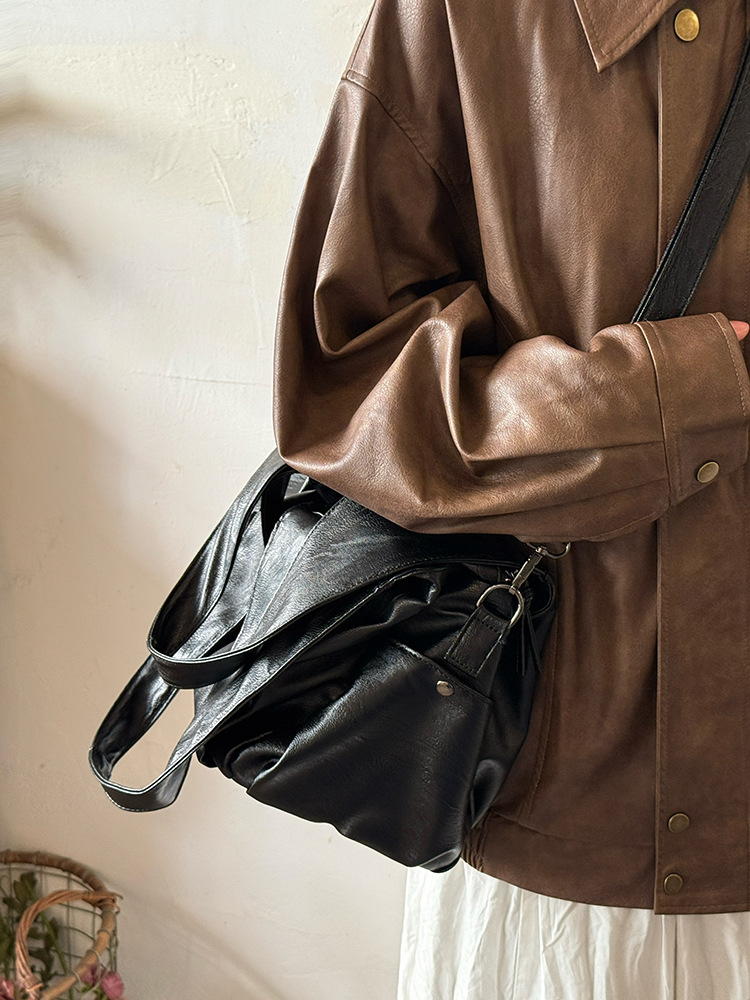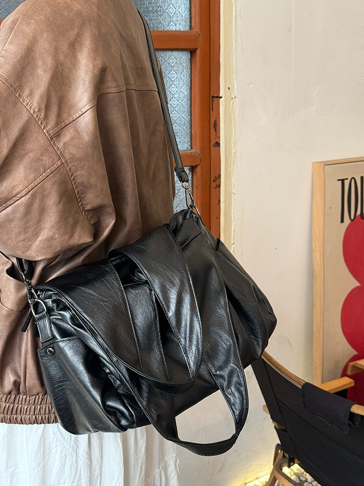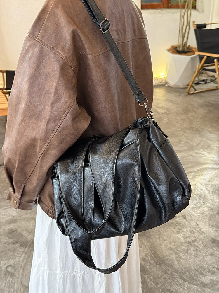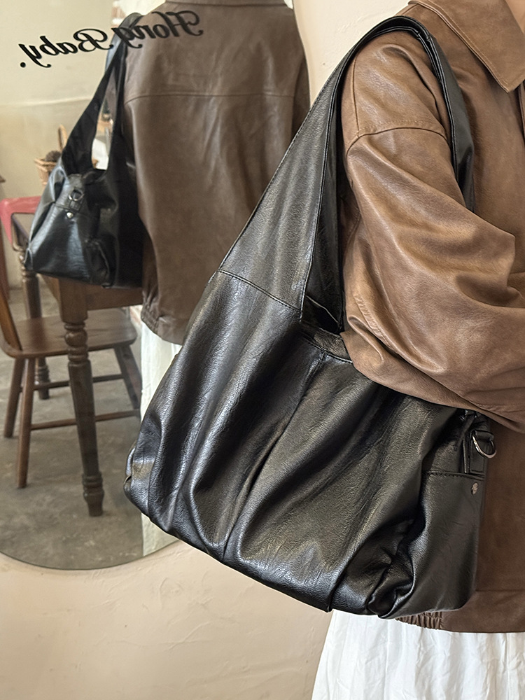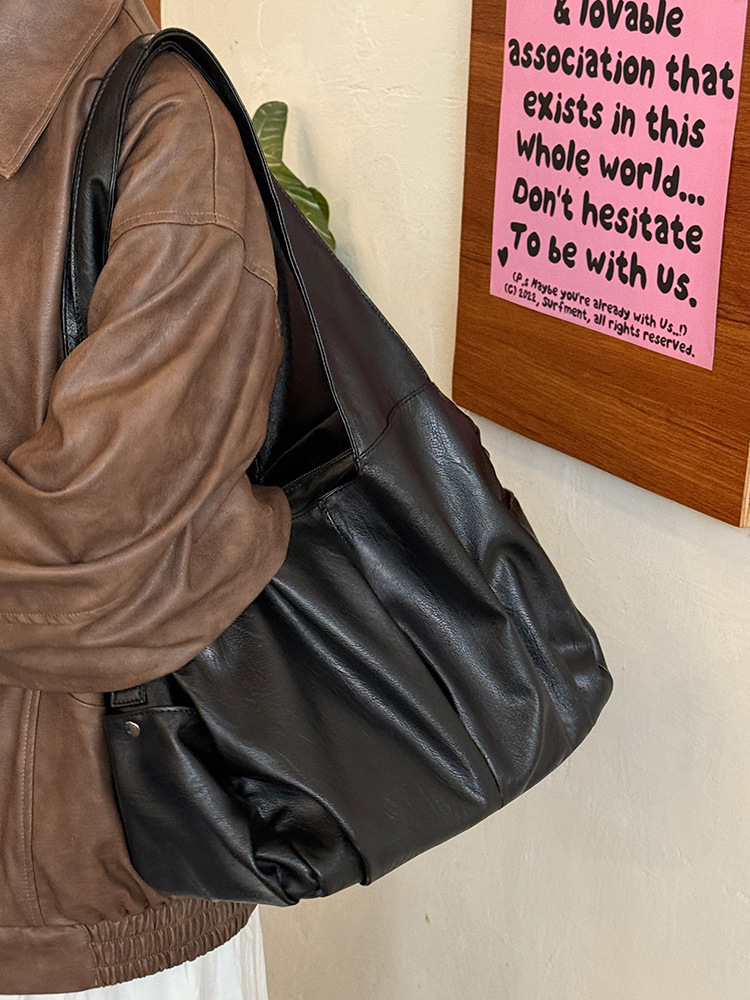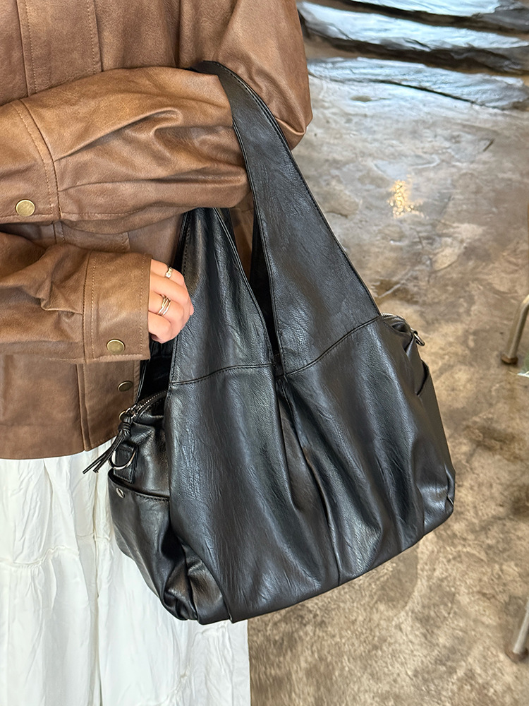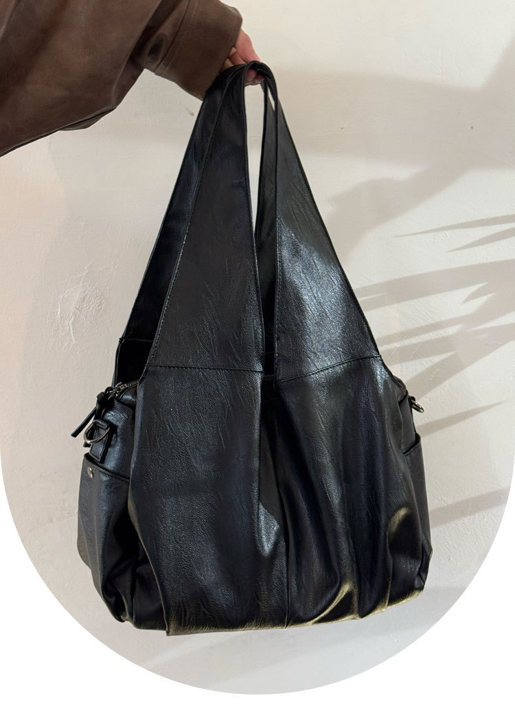 The ultimate effortless carry-all. This oversized black slouchy hobo bag is crafted from soft, buttery vegan leather with a naturally worn, lived-in texture ? perfectly on-trend with the dark academia and indie aesthetic. Spacious enough for a laptop, gym gear, or a full day out. Features dual top handles, side zip pockets, and D-ring hardware for a convertible shoulder or crossbody carry.