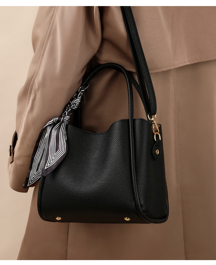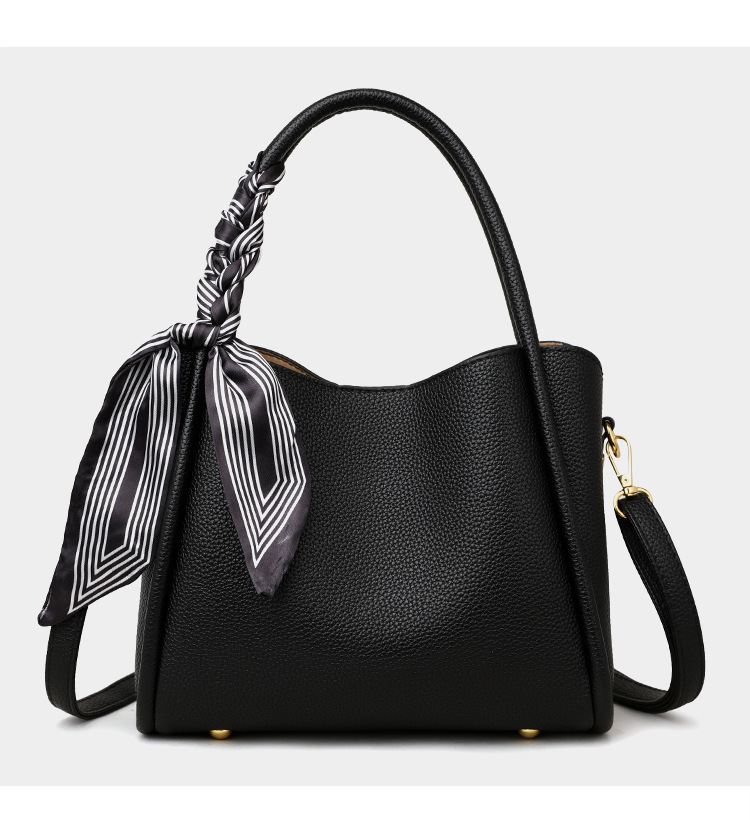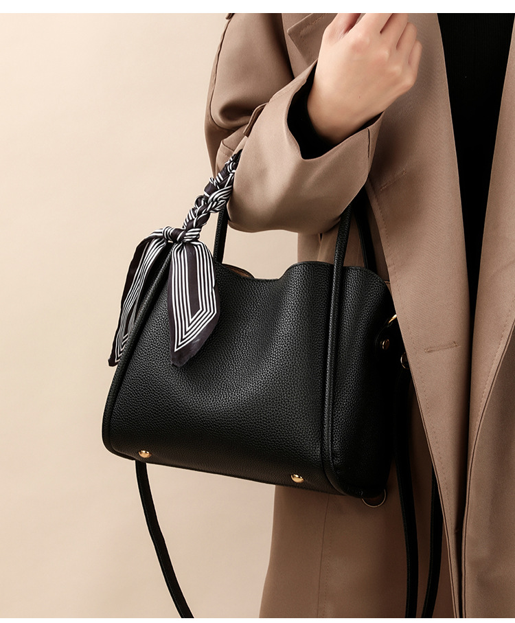 Black Leather Tote Bag Women | Scarf Handle Shoulder Handbag | Pebbled Crossbody Satchel Bag with Silk Ribbon Detail