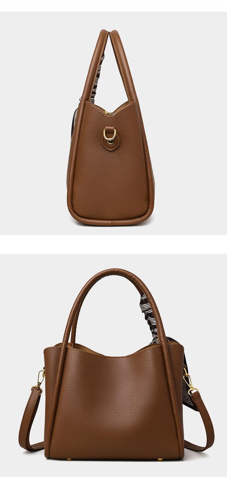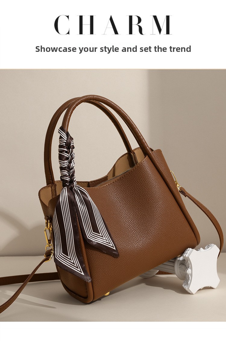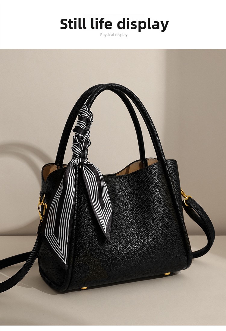 Turn every outing into a fashion statement with our elegant black pebbled leather tote bag. Featuring a chic striped silk scarf detail woven through the top handle, gold hardware feet, and a detachable adjustable crossbody strap for versatile carrying options. The soft structured pebble texture body offers spacious interior storage for all your daily essentials. Sophisticated, timeless, and effortlessly stylish for work, shopping, travel, and every occasion in between.