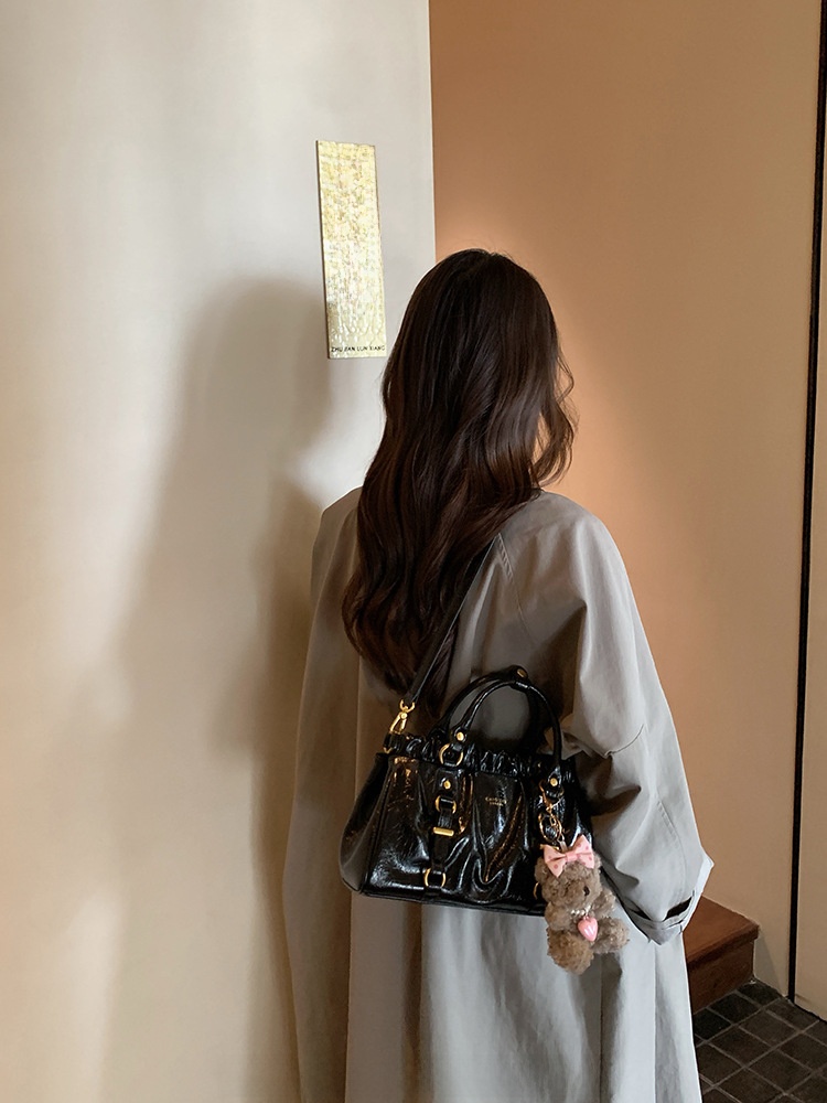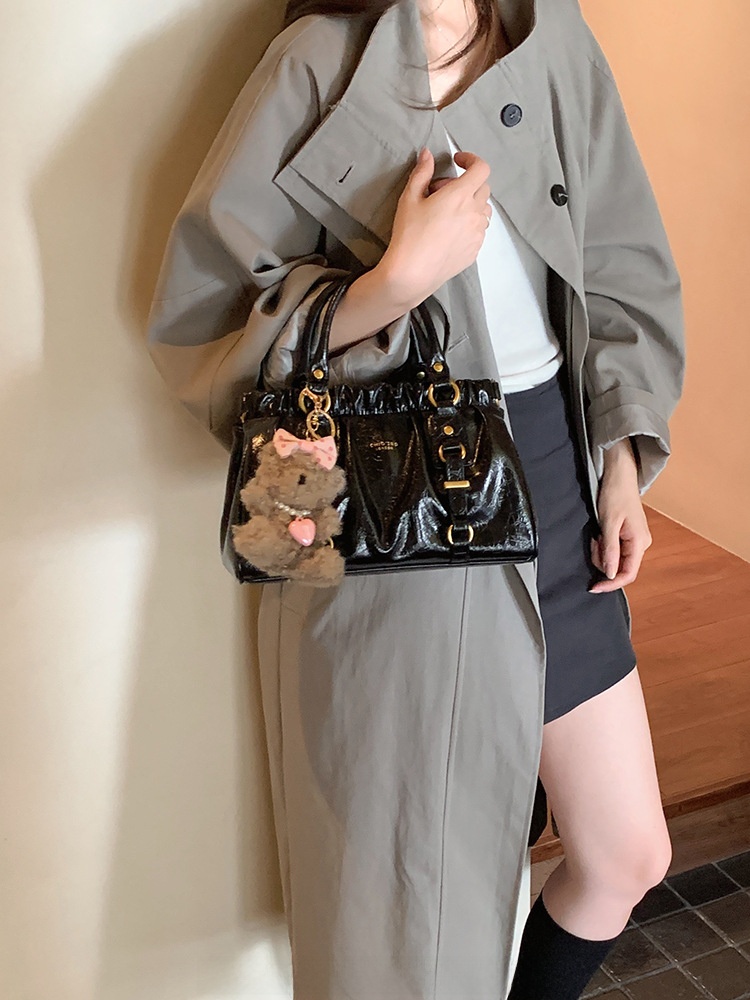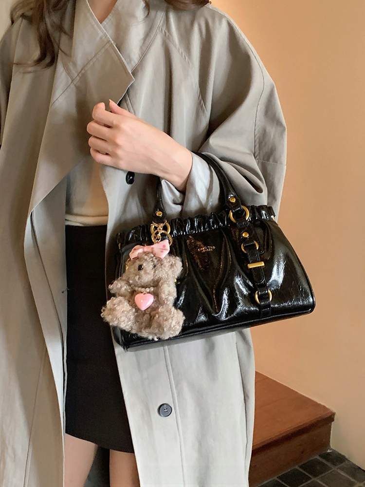 Carry London's finest with the CHIO 2ND LONDON Black Patent Leather Ruched Satchel Bag. This statement handbag blends glossy patent leather, rich gold hardware, and elegant ruched detailing into one irresistible silhouette. Complete with a playful teddy bear charm, dual top handles, and a detachable crossbody strap, it effortlessly fuses luxury aesthetics with everyday versatility. From brunch to evening soir�es, this is the bag that does it all ? with serious style.