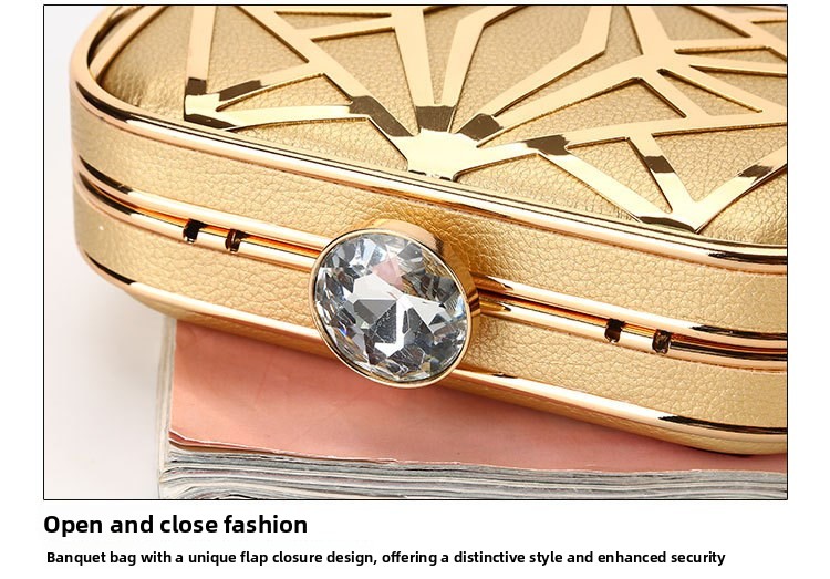 This show-stopping clutch features intricate geometric patterns reminiscent of the roaring twenties and art deco era. The metallic gold finish catches the light beautifully, while the crystal clasp adds a touch of sparkle and luxury. The versatile chain strap offers multiple carrying options to suit your style and comfort needs.