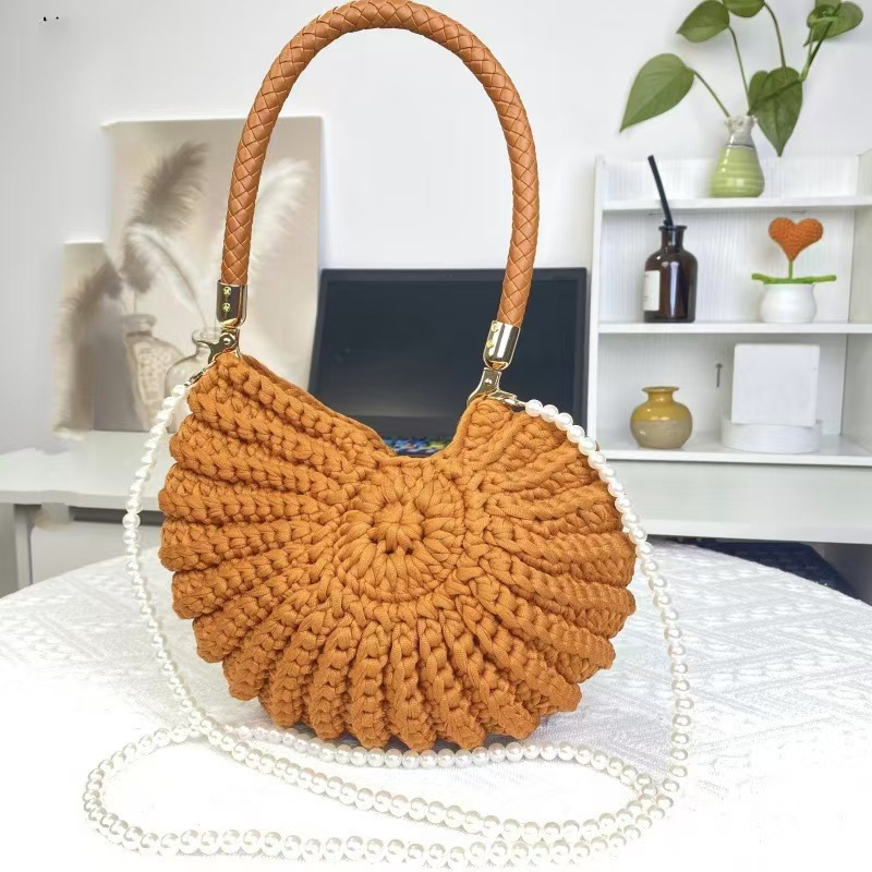 Carry a piece of artisan craftsmanship with this stunning handmade crochet knit handbag. Available in five gorgeous shades ? cream, rust, taupe, black, and white ? each bag features a chic round silhouette, a structured top handle with gold hardware accents, and an optional pearl bead chain strap. Perfect for beach days, brunches, farmers markets, or adding a bohemian touch to any everyday outfit.