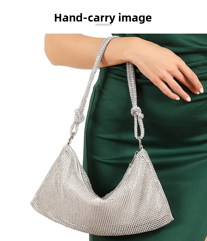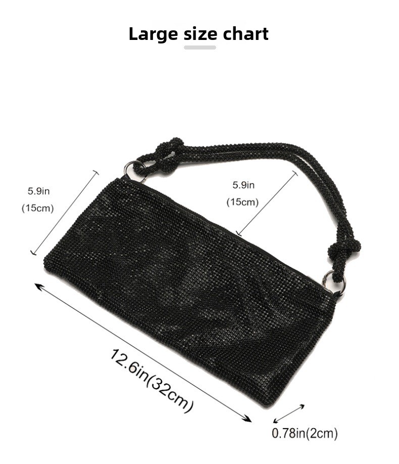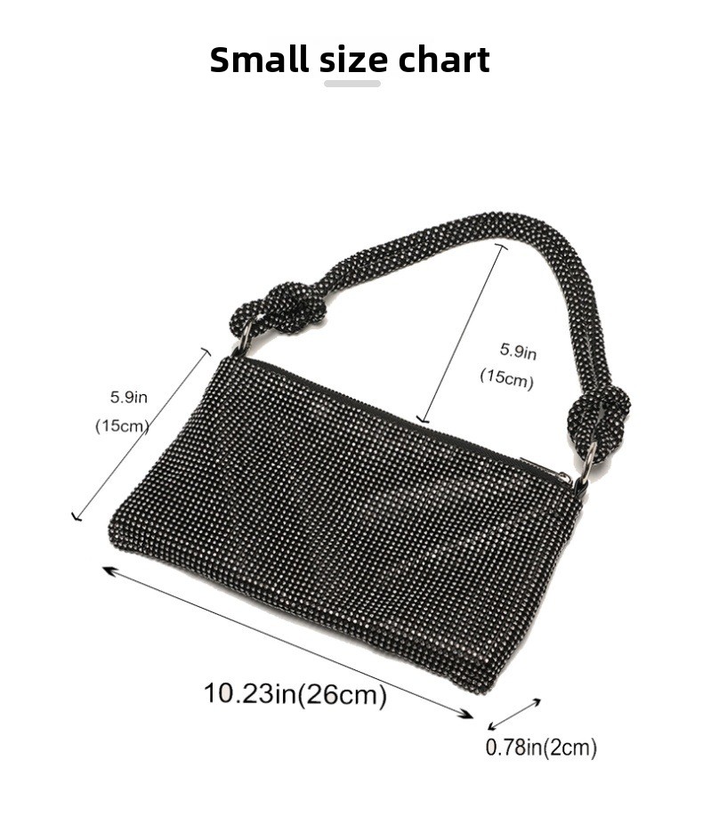 Turn heads at every event with this fully rhinestone-encrusted evening bag featuring a stunning knotted crystal chain strap and zipper closure. Available in Gold, Black, and Silver, this glamorous mini shoulder bag is the perfect finishing touch for weddings, galas, cocktail parties, proms, and nights out. Lightweight, eye-catching, and effortlessly luxurious ? carry it by hand or drape the crystal strap over your wrist for an ultra-chic look.