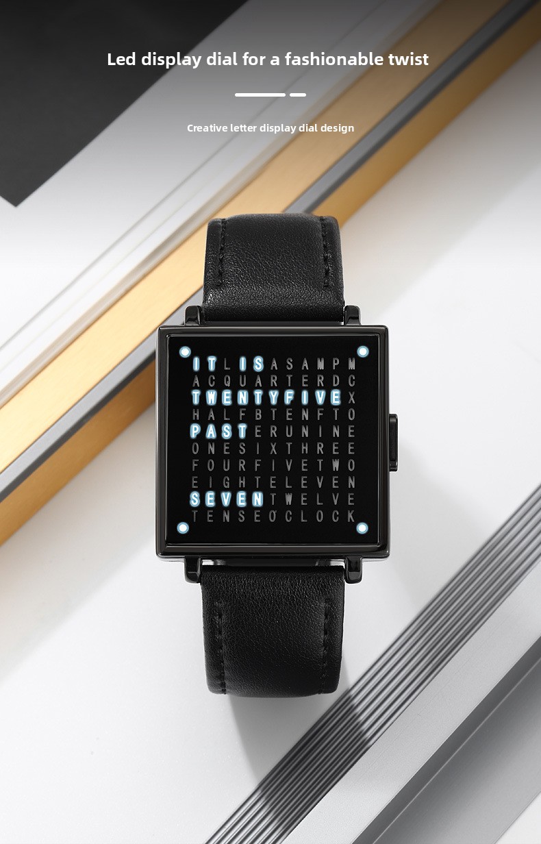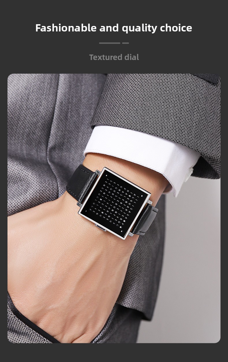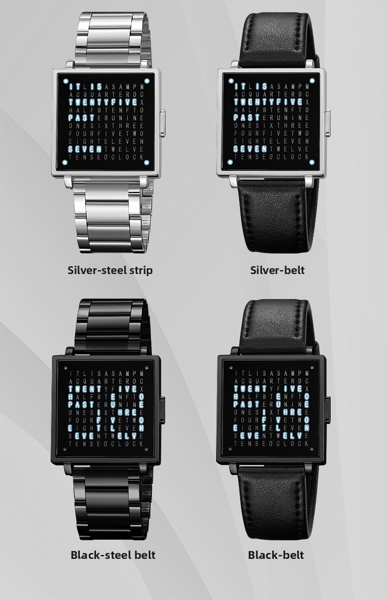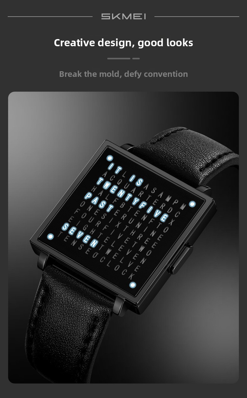 Tell time like no one else with the SKMEI Word Clock Watch ? one of the most unique and conversation-starting timepieces you'll ever wear. Instead of hands or digits, this creative square-dial watch displays the time in illuminated words across a sleek black letter-grid face. Paired with a premium black leather strap and a polished silver square case, it's the perfect fusion of art, design, and function. A guaranteed talking point on any wrist ? ideal as a gift or a personal statement piece.