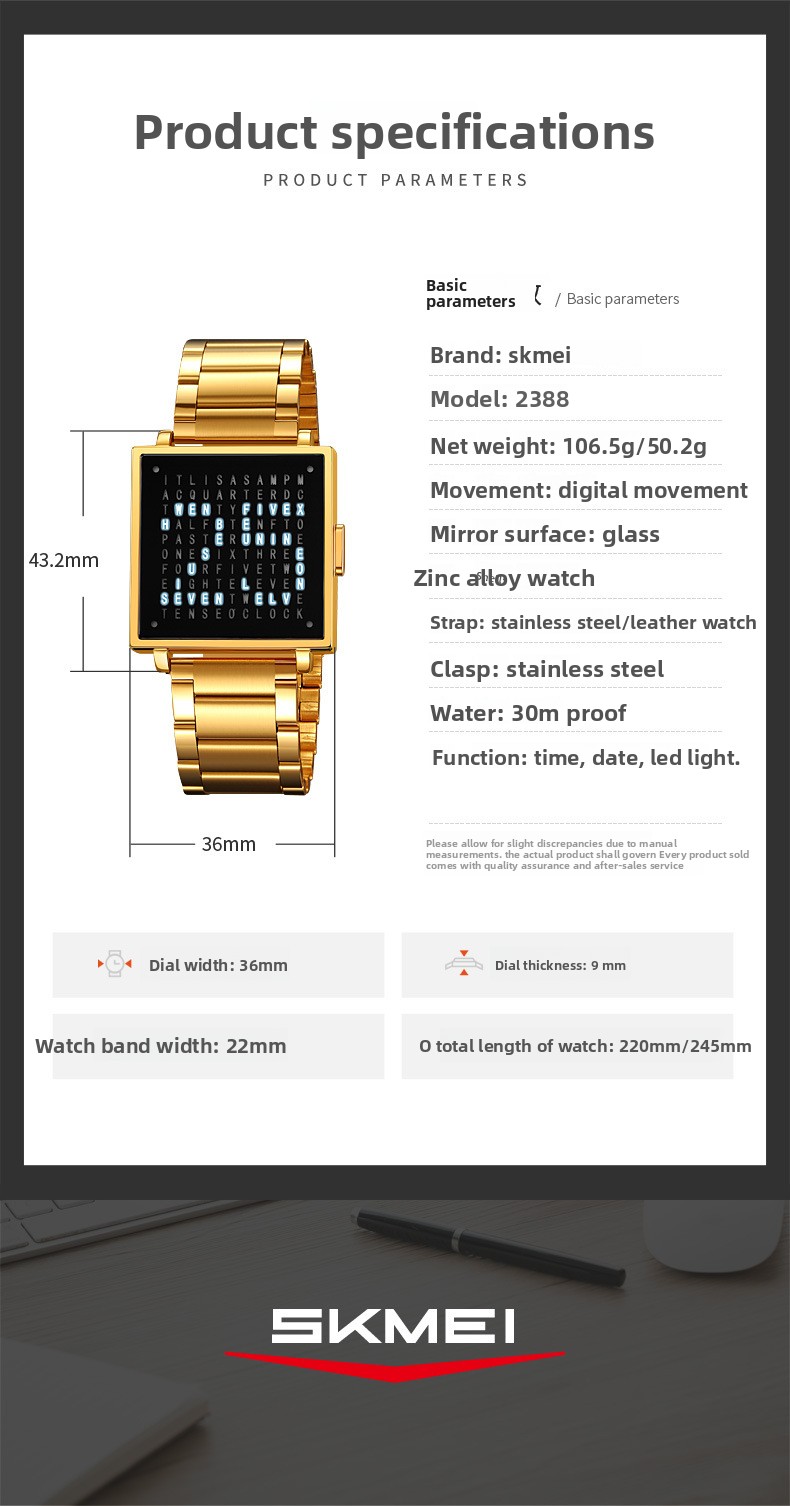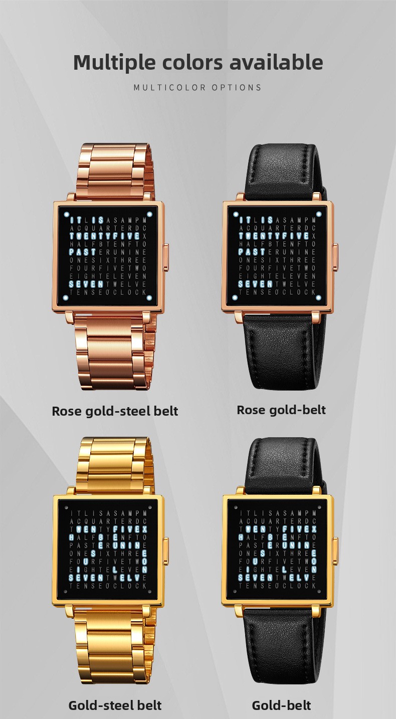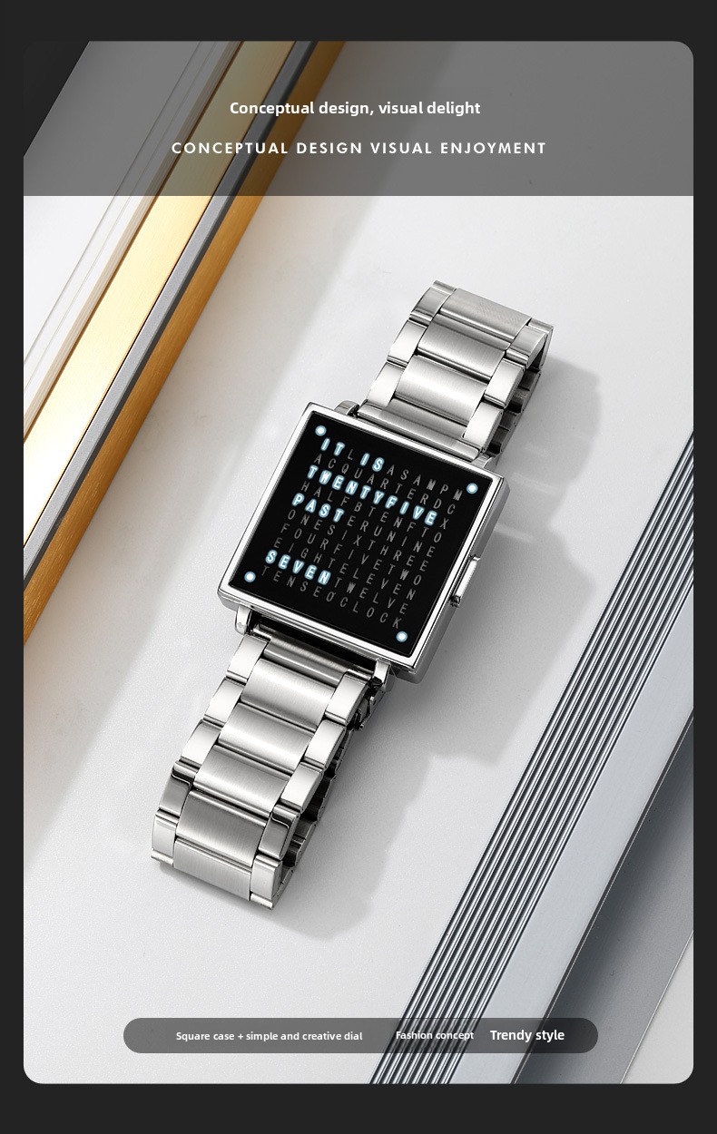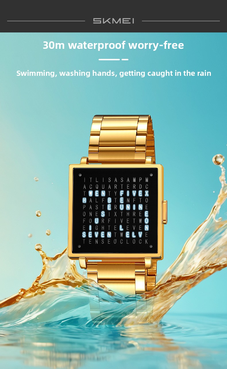 Tell time like no one else with the SKMEI Word Clock Watch ? one of the most unique and conversation-starting timepieces you'll ever wear. Instead of hands or digits, this creative square-dial watch displays the time in illuminated words across a sleek black letter-grid face. Paired with a premium black leather strap and a polished silver square case, it's the perfect fusion of art, design, and function. A guaranteed talking point on any wrist ? ideal as a gift or a personal statement piece.