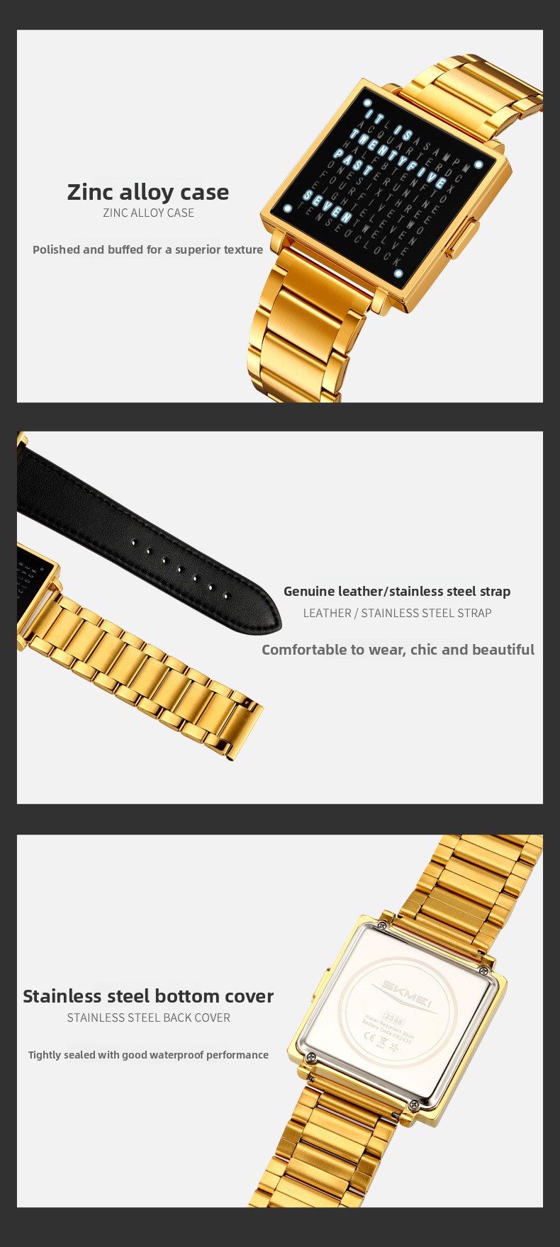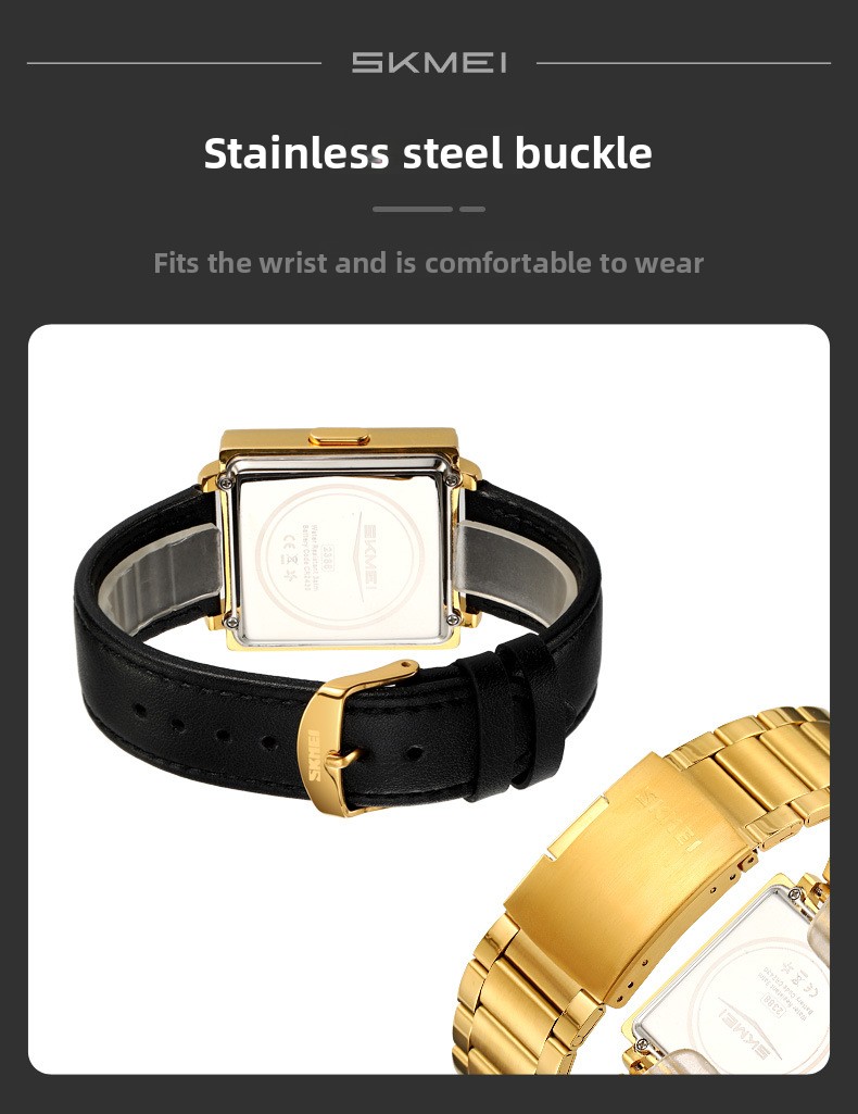 Square dial design with zinc alloy case and stainless steel or genuine leather strap options.