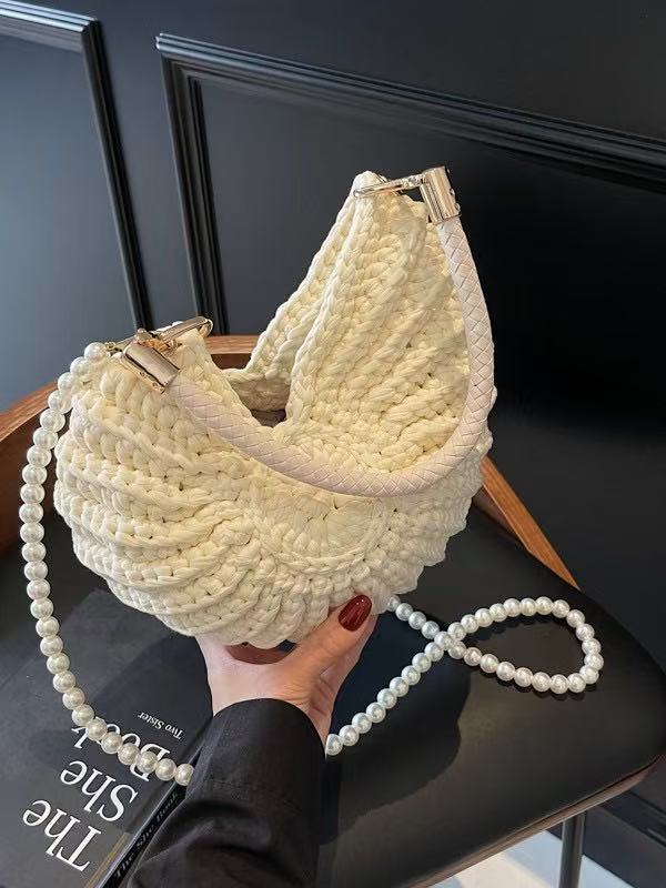 White Crochet Shell Bag | Pearl Chain Strap Handbag Woven Shoulder Purse for Women